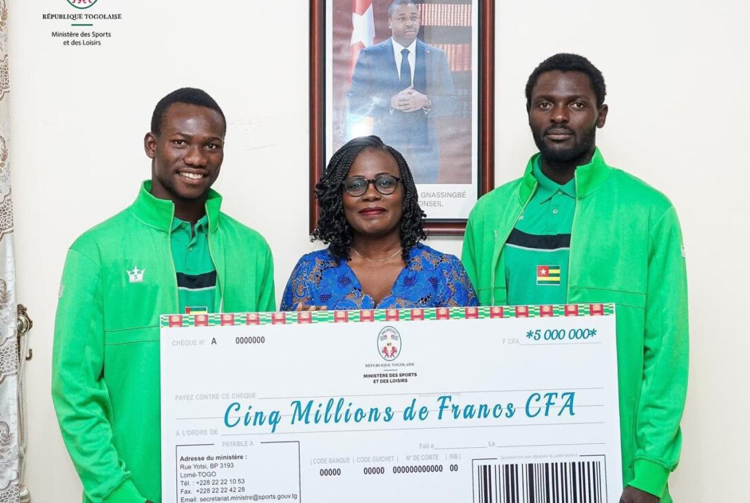 Le ministère des Sports du Togo félicite Bruno Kotoka et Achile Samani, qualifiés pour le Mondial de beach-volley, et leur remet un chèque de 5 millions FCFA en guise de récompense.