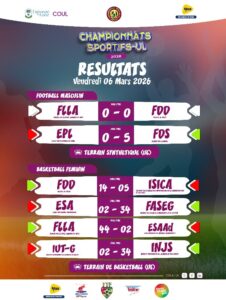 Le match d’ouverture a opposé la Faculté des Sciences de l’Homme et de la Société (FSHS), championne en titre, à l’Institut National de la Jeunesse et des Sports (INJS). La rencontre s’est soldée par un score de parité (1-1). Rémi Sokpo a ouvert le score pour la FSHS à la 21ᵉ minute, avant l’égalisation d’Ismaël Koukos à la 61ᵉ minute.