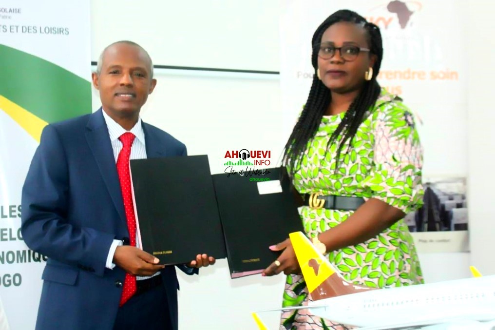 Lomé – (Togo). Ce Mercredi 13 octobre 2021 a eu lieu au Ministère des Sports et des Loisirs une cérémonie de signature d’un accord de partenariat entre la Compagnie aérienne panafricaine, ASKY et le Ministère en charge des sports du Togo.